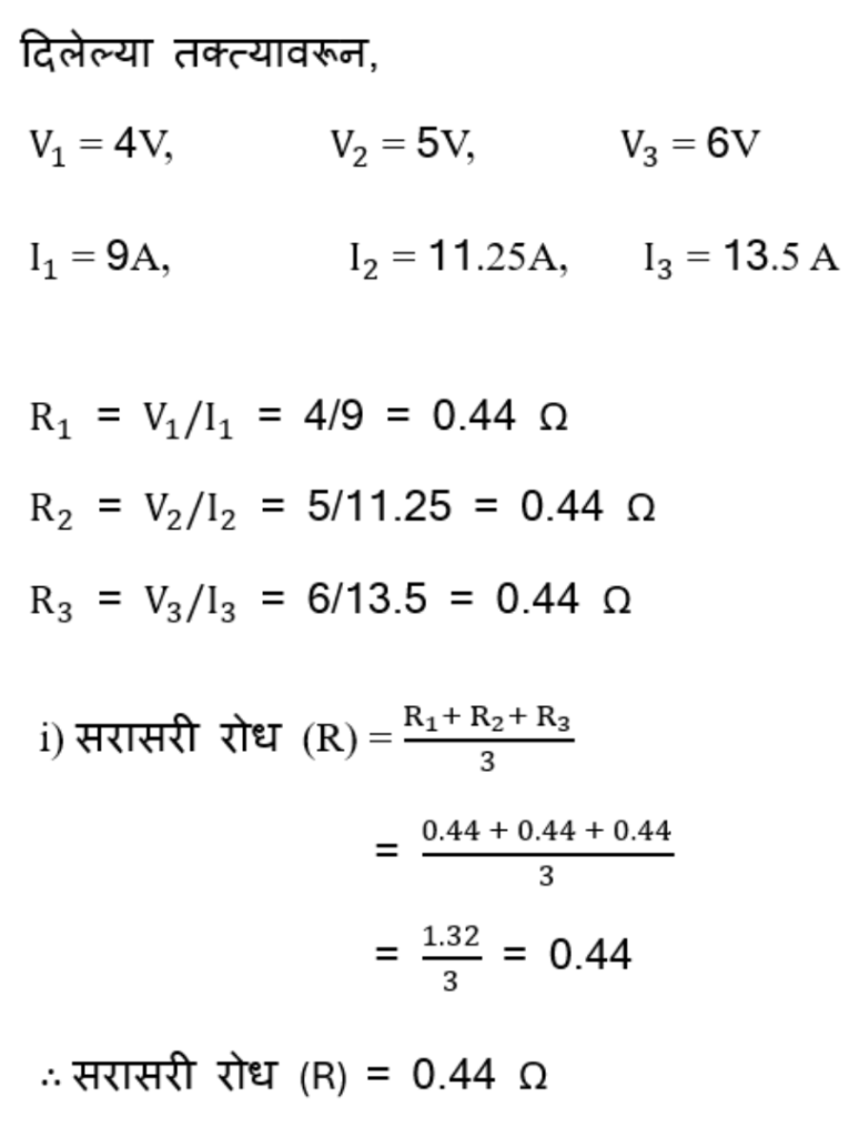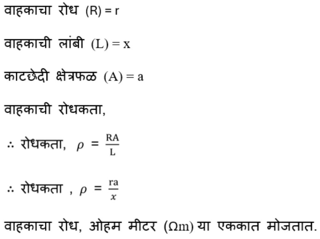 6. ‘x’ एवढ्या लांबीच्या वाहकाचा रोध ‘r’ व त्याच्या काटछेदाचे क्षेत्रफळ ‘a’ असल्यास त्या वाहकाची रोधकता किती असेल ? तो कोणत्या एककात मोजतात ?