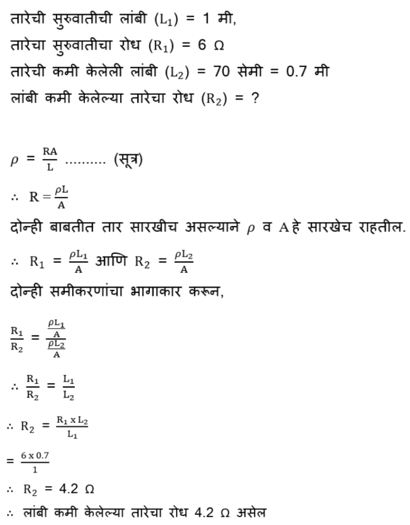 अ. 1m नायक्रोमच्या तारेचा रोध 6 Ω आहे. तारेची लांबी 70 cm केल्यास तारेचा रोध किती असेल ?