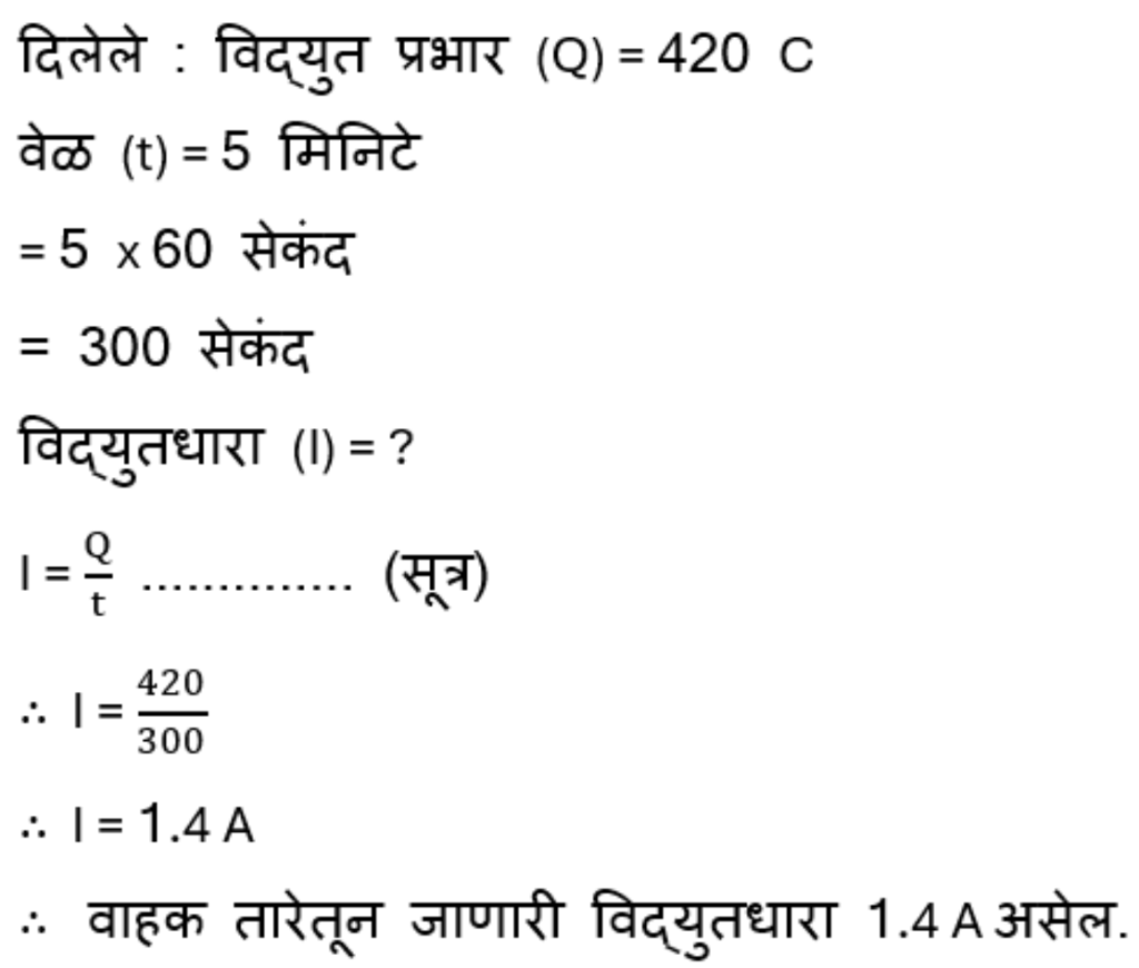 इ. एका वाहक तारेतून 420 C इतका विद्युत प्रभार 5 मिनिटात वाहत असेल तर या तारेतून जाणारी विद्युतधारा किती असेल ?