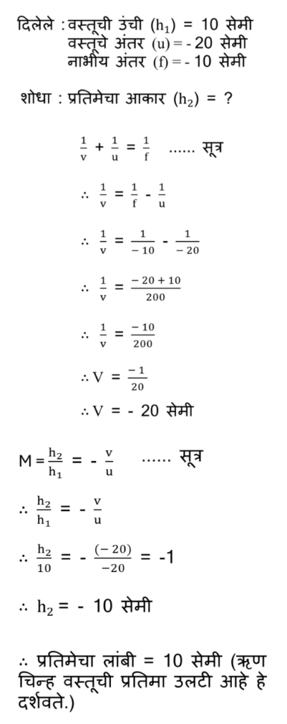 इ. 10 सेमी लांबीची काठी 10 सेमी नाभीय अंतर असलेल्या अंतर्वक्र आरशाच्या मुख्य अक्षावर ध्रुवापासून 20 सेमी अंतरावर ठेवली आहे. तर अंतर्वक्र आरशाद्वारे मिळणारी प्रतिमा किती लांबीची असेल ?