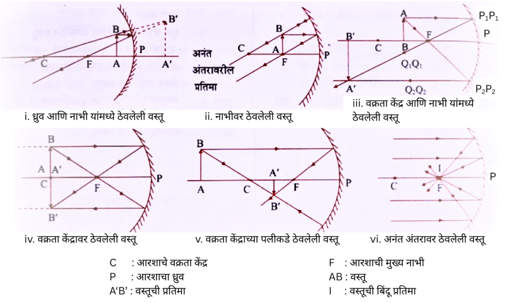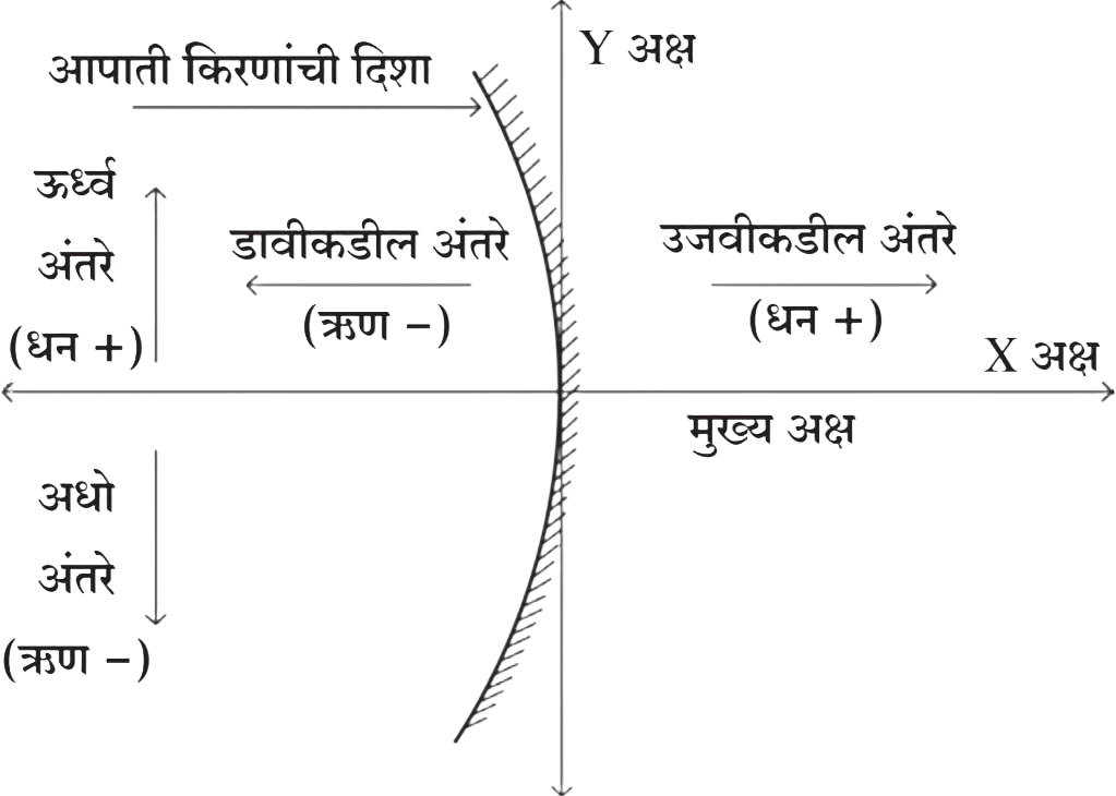 ii) ‘क्ष’ अक्ष हा मुख्य अक्ष असतो आणि मुख्य अक्षाला समांतर असलेली सर्व अंतरे आरशाच्या ध्रुवापासून मोजली जातात.