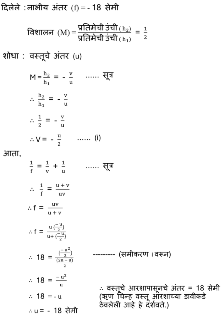 आ. 18 सेमी नाभीय अंतर असलेल्या बहिर्वक्र आरशासमोर ठेवलेल्या वस्तूची प्रतिमा ही मूळ वस्तूच्या उंचीच्या निम्म्या उंचीची मिळते. तर ती वस्तू बहिर्वक्र आरशापासून किती अंतरावर ठेवलेली असेल ?