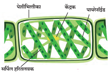 v) स्पायरोगायरामध्ये सर्पिल, हिरवी, तंतूसारखी रचना असलेली हरितलवके आढळतात, तसेच या सर्पिल हरितलवकात अनेक पायरेनॉईड दिसून येतात.