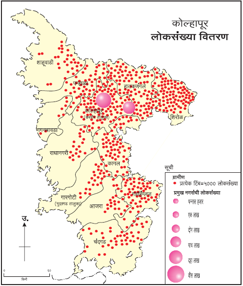 प्रश्न. ४. कोल्हापूर जिल्ह्याच्या लोकसंख्या वितरणाचा नकाशा अभ्यासा व खालील प्रश्नांची उत्तरे द्या.
