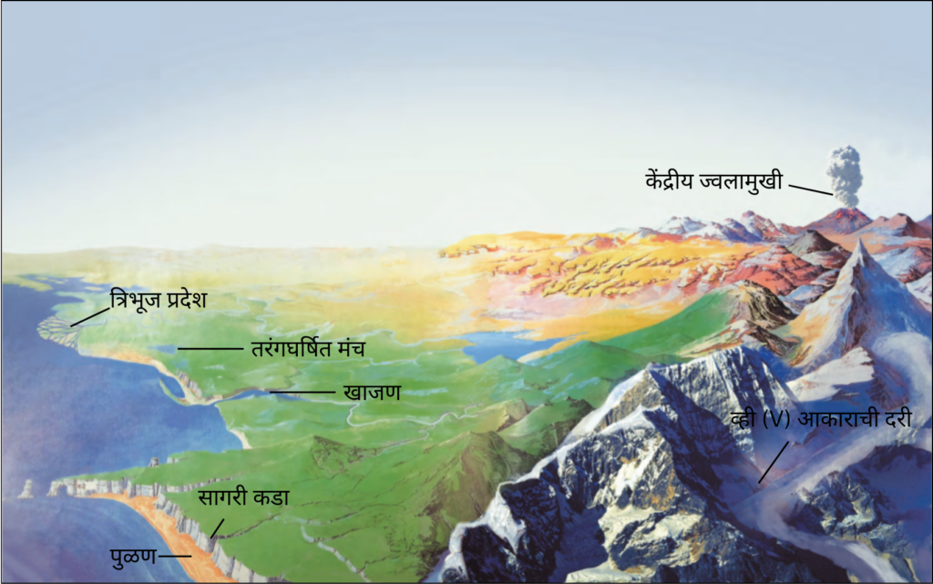(धबधबा, त्रिभुज प्रदेश, हिमगव्हर, गिरिशृंग, बारखाण, हिमोढ, कुंभगर्ता, भूछत्र खडक, विलयविवर, खाजण, पुळण, लवणस्तंभ)